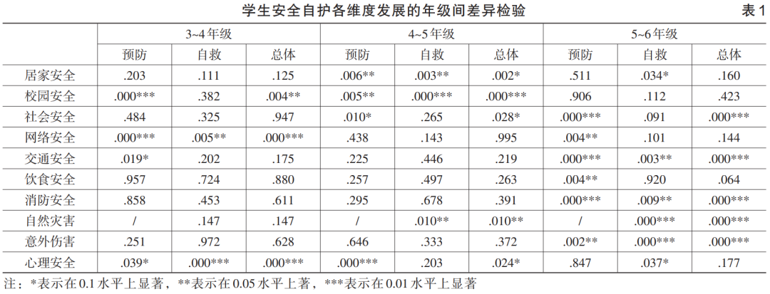 但进一步对学生在安全自护各维度的平均得分按年级逐级进行差异检验笔者发现,无论是从总体还是分别从安全预防知和应急自救来看,学生的安全自护平均得分在年级间出现显著提升的维度数量随年级增高而逐渐增多,从 3~4 年级时的 9 个维度差异显著 (总体 3 个、预防 4 个和自救 2 个) 到 4~5年级时的 12 个维度 (总体 5 个、预防 4 个和自救 3个),再到 5~6 年级时的 17 个维度 (总体 5 个、预防 6 个和自救 6 个);其次,差异的显著性水平也随年级增高而逐渐提升,从 3~4 年级时的总体差异显著性达到.05 水平 0 个、.01 水平 1 个和.001 水平 2 个维度到 4~5 年级时的.05 水平 3 个 、.01 水 平 1 个和.001 水平 1 个维度,再到 5~6 年级时的.05 水平 0个、.010 水平 0 个和.001 水平 5 个维度。这一结果表明,虽然农村小学生的安全自护能力随年级增长而缓慢提高,但提高的速度随年级增长而逐渐加快,5~6 年级是学生的安全自护能力发展最快的一个阶段。(见表 1)
