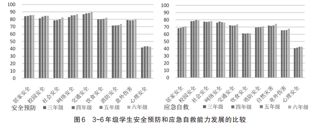 《中小学公共安全教育指导纲要》明确指出,安全教育要“培养学生的社会安全责任感,使学生逐步形成安全意识,掌握必要的安全行为知识和技能,了解相关的法律法规常识,养成在日常生活和突发安全事件中正确应对的习惯,最大限度地预防安全事故发生和减少安全事件对中小学生造成的伤害,保障中小学生健康成长”。其中,“预防安全事故发生”关键是要让学生掌握必要的安全行为的知识和技能,以预防和避免日常安全事故的出现;而“减少安全事件对学生的伤害”则侧重发展学生有效应对突发安全事件并进行自救自护的技能。因此,“安全预防”“应急自救”既是学生安全教育的两大目标,也是与学生生命安全密切相关的两大自护能力,本次调查主要侧重对学生这两方面能力的发展进行分析。